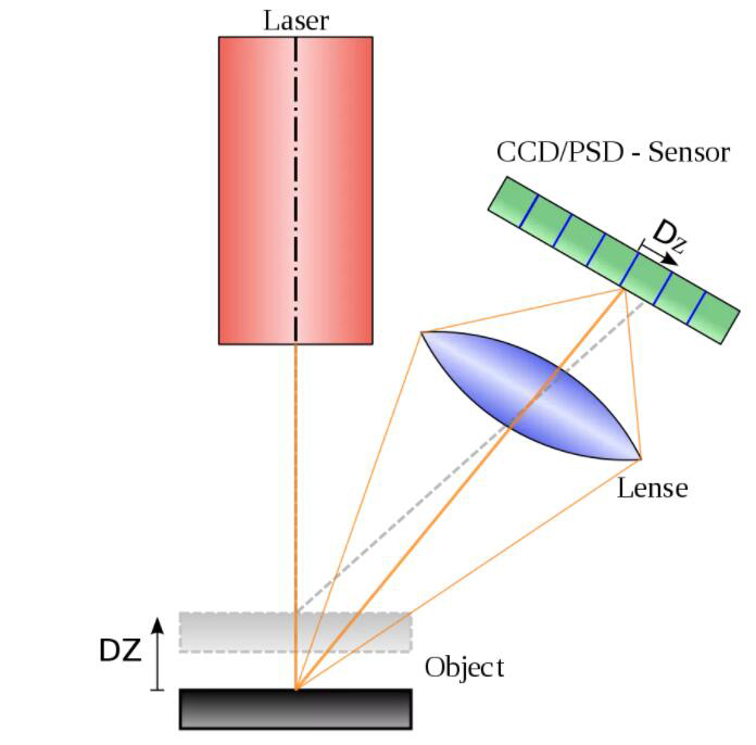 圖1–激光三角測(cè)量設(shè)置使用相機(jī)和激光位置的固定角度偏移,可以推導(dǎo)出檢測(cè)表面和相機(jī)傳感器之間的線性距離。
