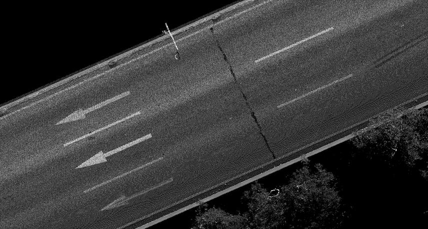 本項目使用HiScan-Z車載激光移動測量系統(tǒng),精確掃描并獲取道路面的激光點云數(shù)據(jù),通過前期布設(shè)的四等高程水準(zhǔn)點進(jìn)行高程改正,保證激光點云高程精度控制在大中修測量標(biāo)準(zhǔn)范圍內(nèi)(高程精度優(yōu)于3cm),最后通過數(shù)據(jù)生產(chǎn)軟件半自動化處理生產(chǎn)道路縱橫斷面數(shù)據(jù)與路面地形圖。