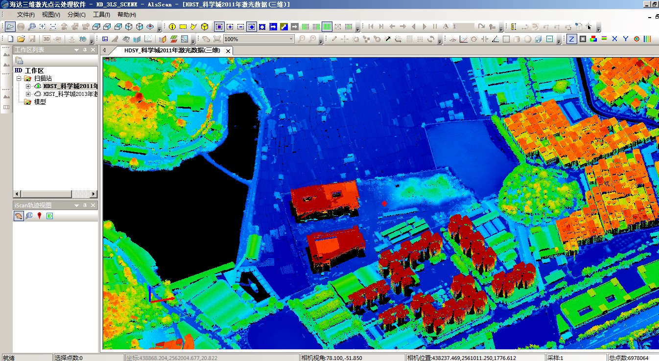 基于激光數(shù)據(jù)的建筑物動態(tài)監(jiān)測,主要是利用不同時期的激光數(shù)據(jù)和影像數(shù)據(jù)生成DSM和DOM,定期檢測變化情況,識別變化區(qū)域,統(tǒng)計合法、非法建筑的存量和增量。以下是以廣東省科學(xué)城兩個不同時期獲取的激光點云數(shù)據(jù)為基礎(chǔ),利用海達三維激光點云處理軟件的建筑物動態(tài)檢測模塊自動識別出房屋平面高度1M的變化區(qū)域。