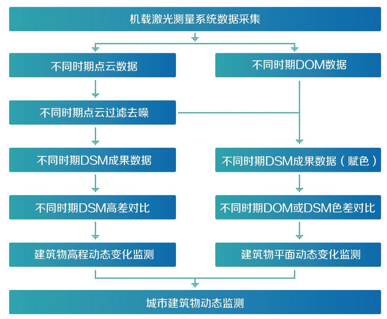 城市規(guī)劃監(jiān)測是以機載激光點云和影像獲取為基礎(chǔ),以激光點云和影像內(nèi)業(yè)處理為核心,結(jié)合城市建筑物動態(tài)監(jiān)測及后續(xù)擴展應(yīng)用需求來實施?;跈C載激光的城市規(guī)劃監(jiān)測需要綜合考慮機載激光數(shù)據(jù)采集、內(nèi)業(yè)處理和平臺管理應(yīng)用等幾個方面,其技術(shù)流程如下: